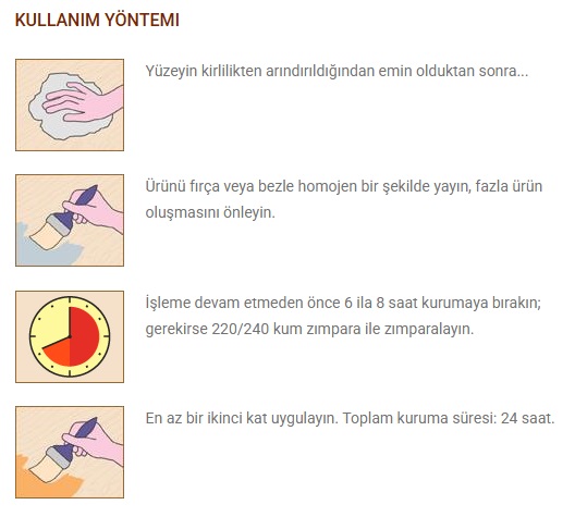 • İnce zımparası (180-220 kum) yapılmış , temiz ve kuru yüzeye gerekli miktarda yağı fırça, rulo, sprey veya bez ile sürünüz.