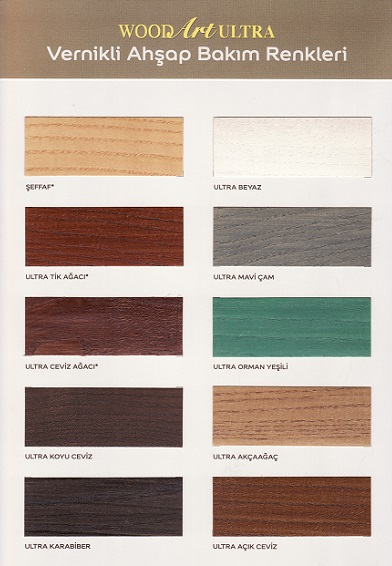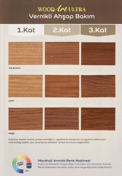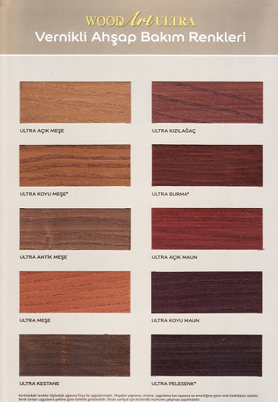 - Uygulanacak renk tonları ahşabın yapısına, cinsine ve uygulama kat sayısına göre değişkenlik gösterebilir.