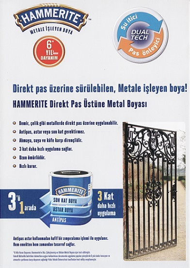- Çıplak çinko, Aluminyum ve galvanize yüzeyler üzerine; Hammerite Metal Boya uygulamadan önce Hammerite Özel Metaller Primeri uygulayın.