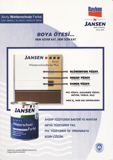 - Her türlü hava koşullarına dayanıklı , çeşitli yüzeylere uygulanabilen, yüksek örtücülükte, ,düşük kokulu , çevre dostu, sararmaya karşı yüksek dirence sahip, yarı mat görünümünde, hem astar kat hem de son kat boyası olarak kullanılan boyadır.
