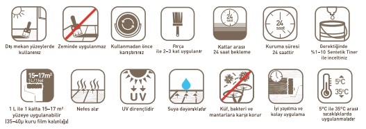 - Tek katta 35-40 µ kuru film kalınlığı bırakacak şekilde uygulandığında 1 lt ile 15-17 m² alan kaplanabilir. (Kayıplar hariç)
