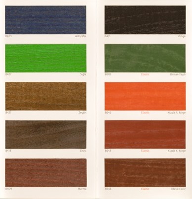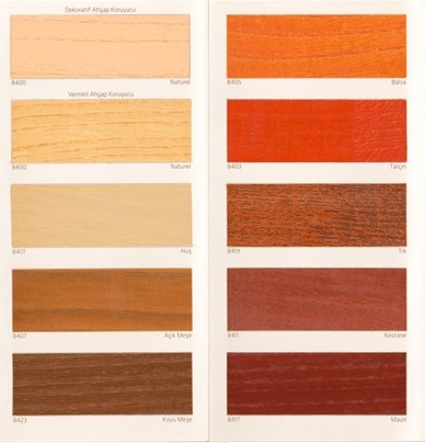 Kartela renkleri, baskı teknikleri nedeni ile orjinal renk tonlarını tam olarak yansıtmayabilir. Uygulama yapılacak ahşabın cinsine, uygulama şekline göre elde edeceğiniz rengin tonu ve parlaklığı değişiklik gösterir. Bu nedenle uygulama öncesi küçük bir alanda rengin test edilmesi tavsiye edilir.